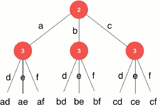 输出:[“ad”,”ae”,”af”,”bd”,”be”,”bf”,”cd”,”ce”,”cf”]